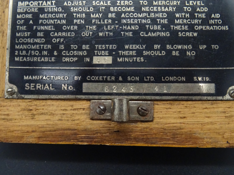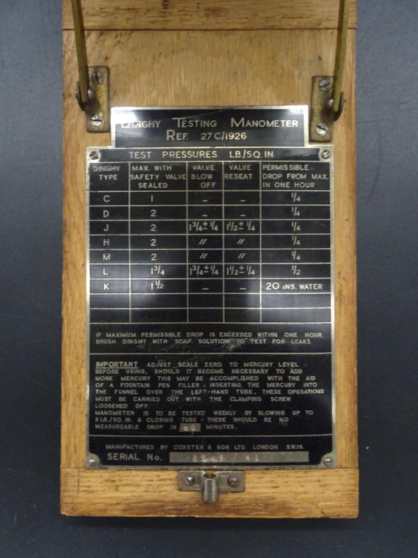 This RAF Survival Dinghy manometer was used to test dinghies regularly or after repairs to check for loss of pressure. Manufactured by Coxeter & Son LTD London this one is dated 1941. Interesting item for the RAF collector you wont come across very often.