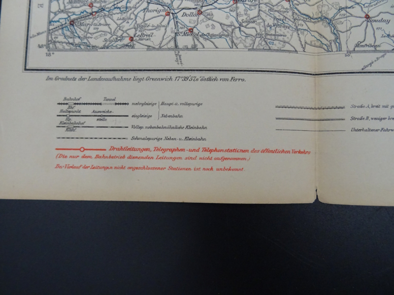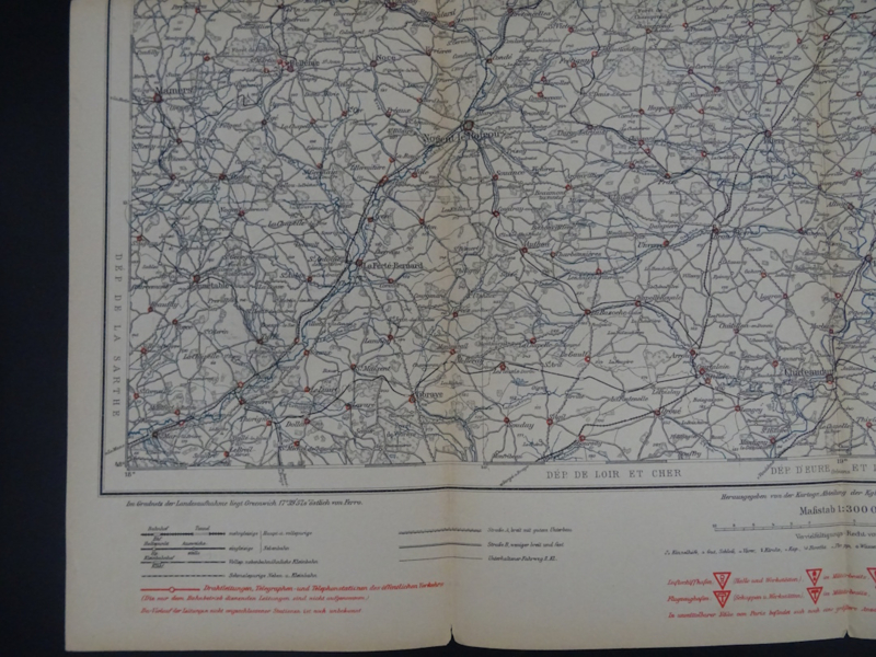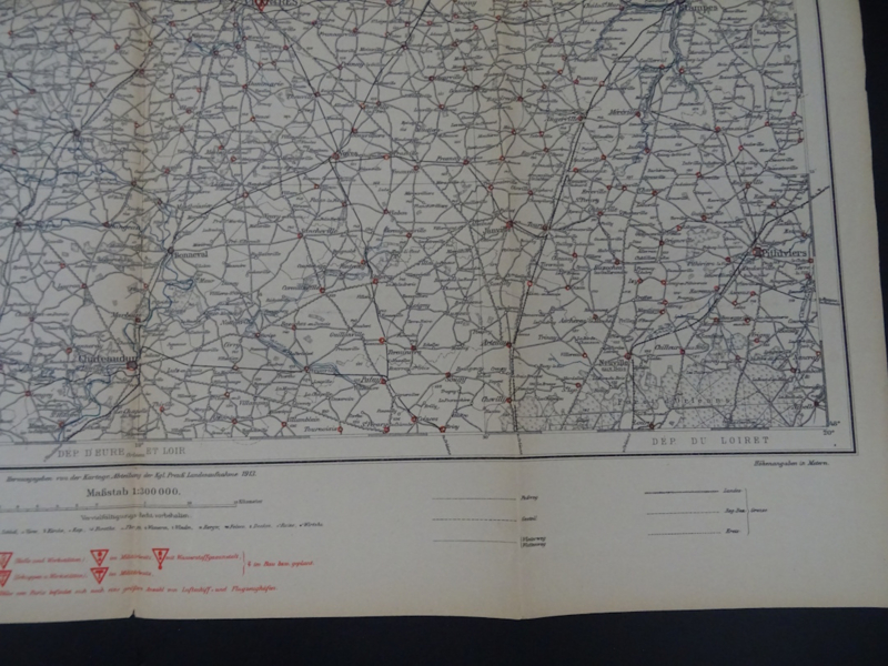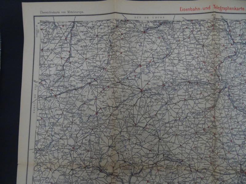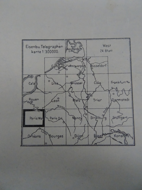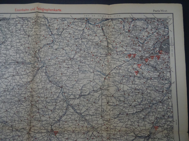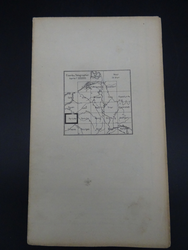 German WW1 Eisenbahn und Telegraphenkarte Paris West, railroad and telegraph map of the Western Paris region. Scale 1:300000, measures 54cm by 46,5cm, reissue of a 1913 map but not dated. Good condition except for 2 small holes in the middle where the folds are.
