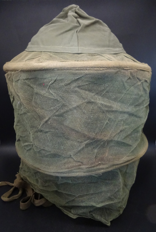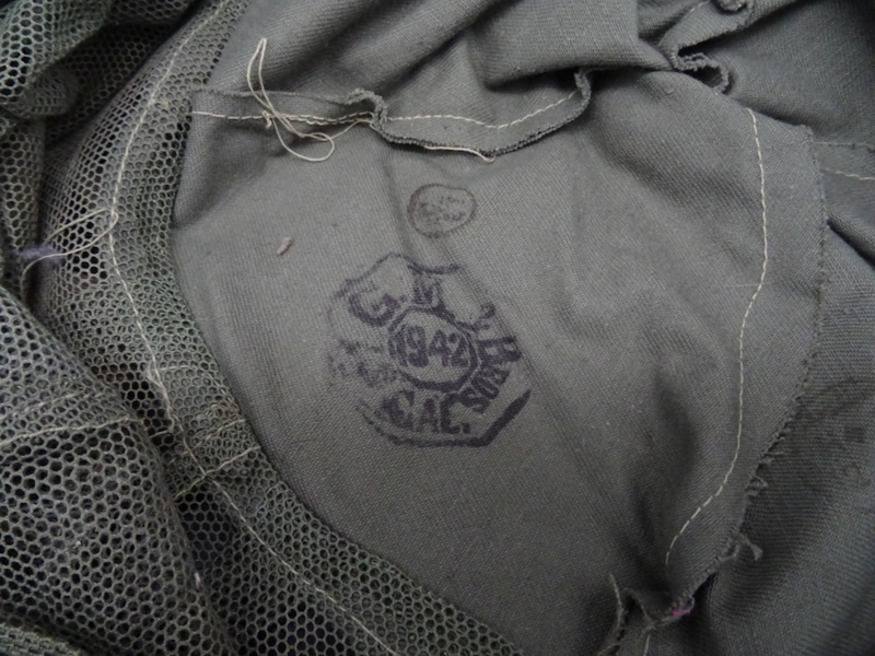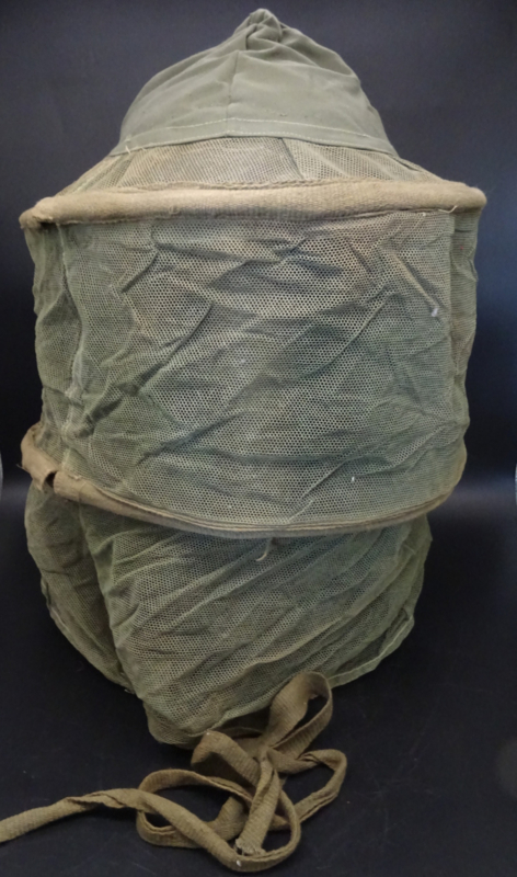 Indian made version of the British mosquito net helmet cover as was used in the Pacific theatre. This version is in a darker green color and has reinforcement ring to keep the net open. In unused condition and maker marked and dated (1942) on the inside.