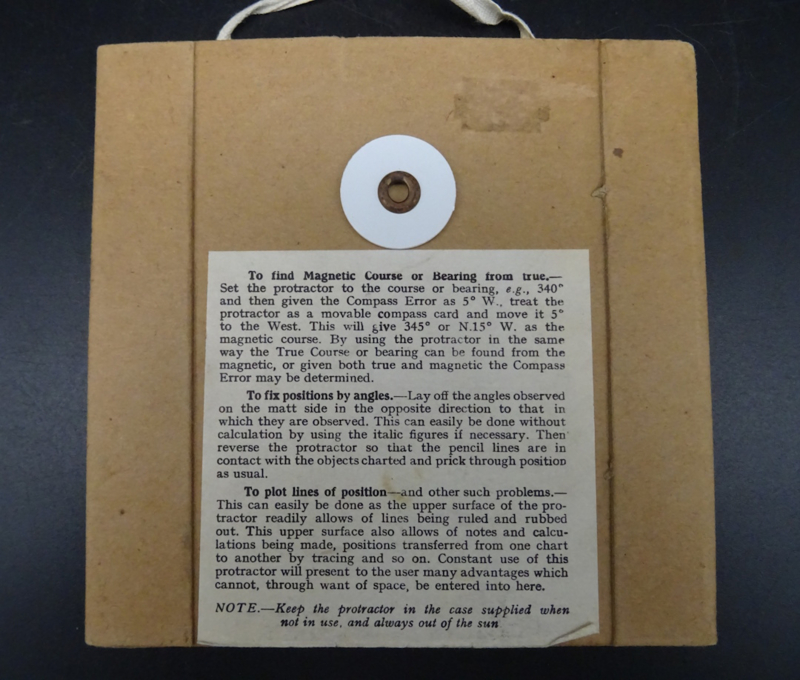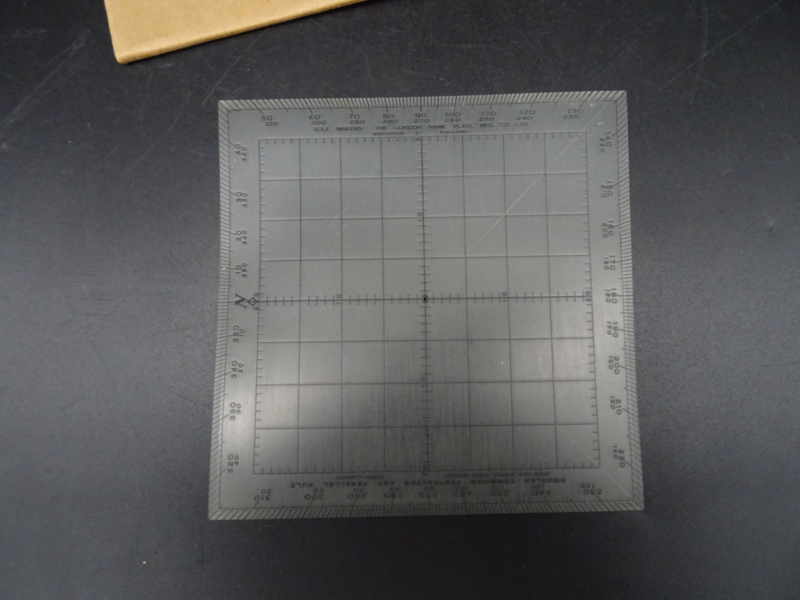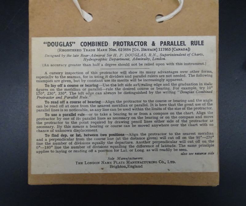 'Douglas' Combined Protractor & Parallel Rule used in aircraft for navigation and to set out correct courses. Made out of clear plastic, comes in cardboard enveloppe with instructions. Made by The London Name Plate Manufacturing Co. Ltd in Brighton England.