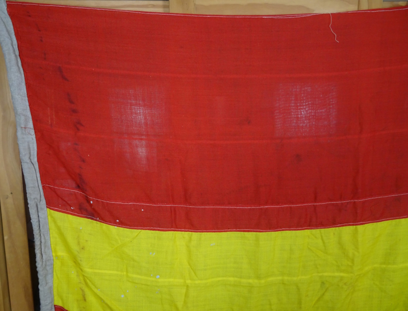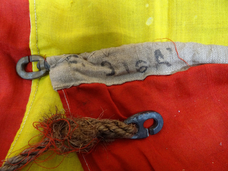 Large Naval Signal Flag, this one stands for the number 1. Did some research and these match with the flags used by the US navy during WW2 but I can't find any markings on the flag itself except for some numbers. Made from fabric so certainly not a modern production flag. Has some little dots of paint and stains on it here and there. 190cm x 130cm