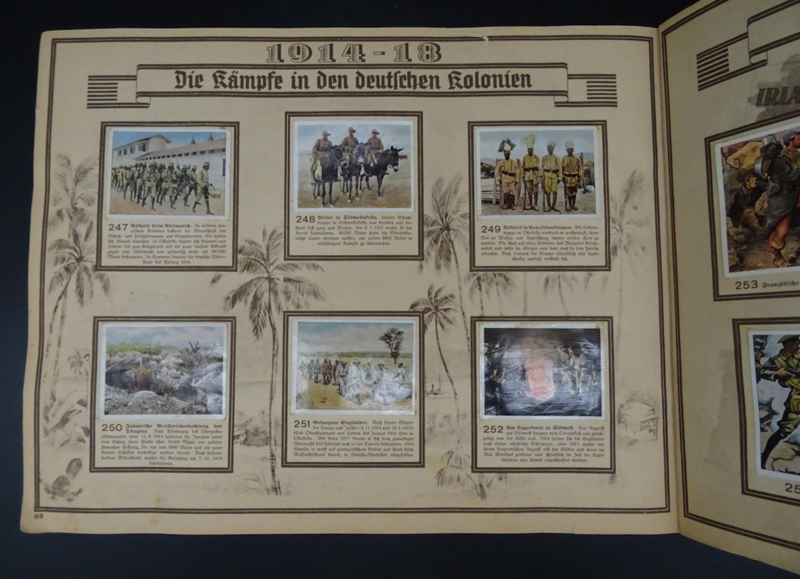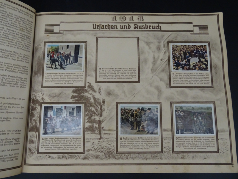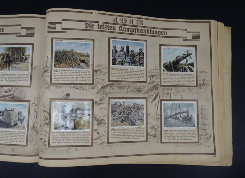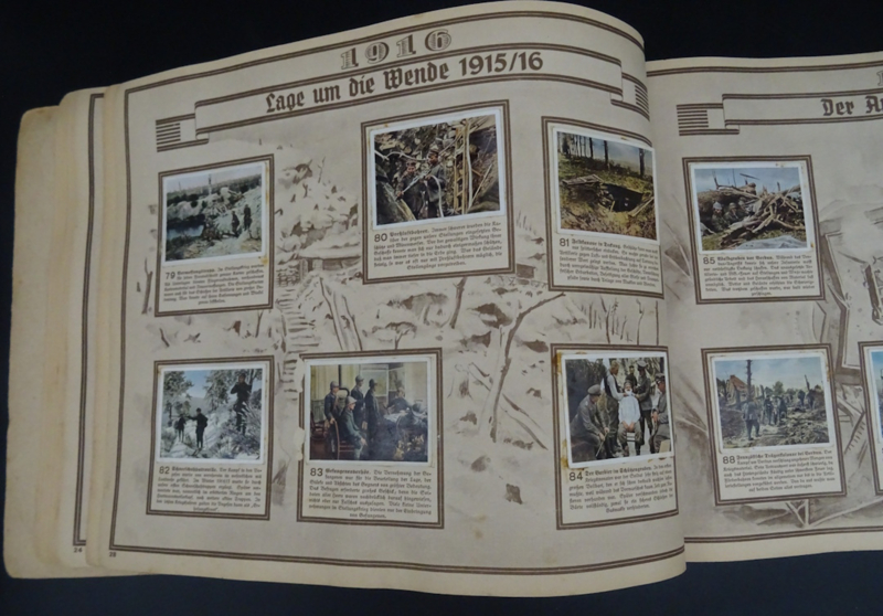 German Cigarette Card Album 'Der Weltkrieg'. Good but used condition with all the card except for one and that is the second one in the book. Published in the 1930's, gives an overview of the entire First World War from 1914 to 1918 covering some of the major battles.