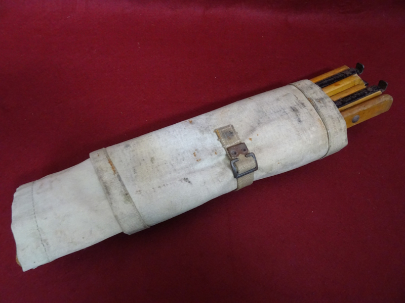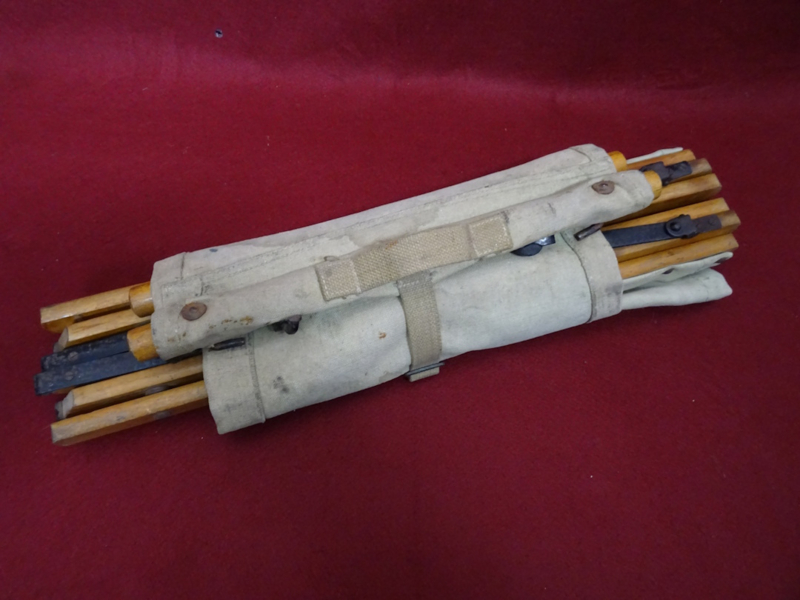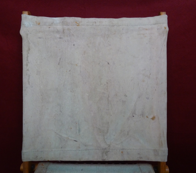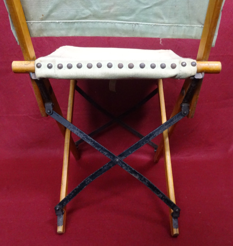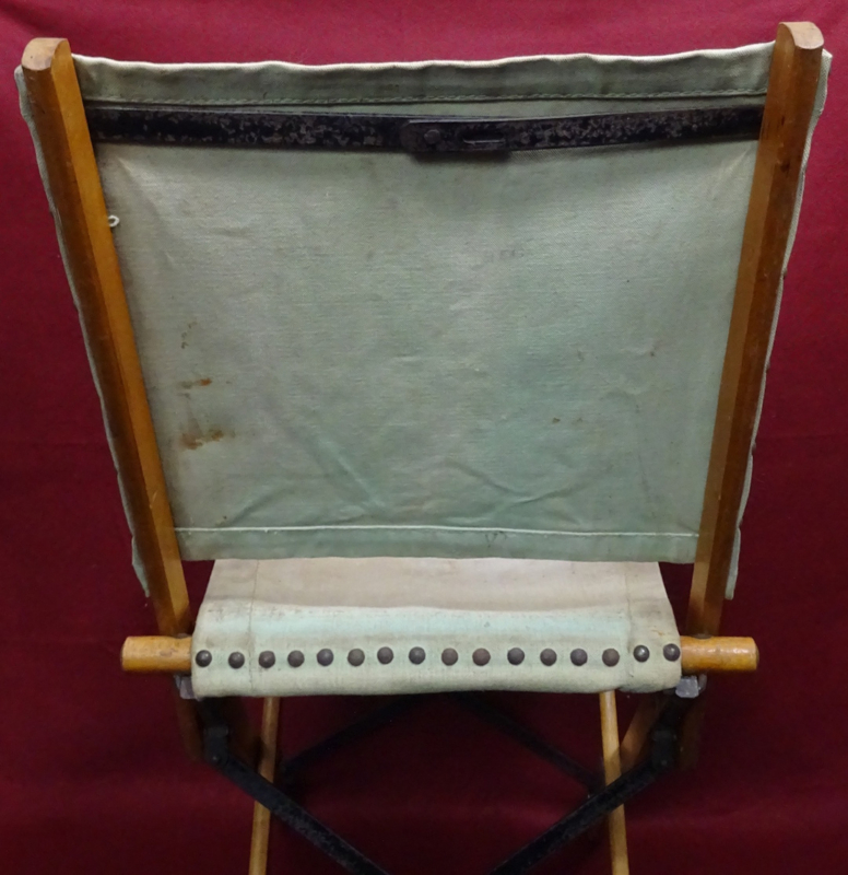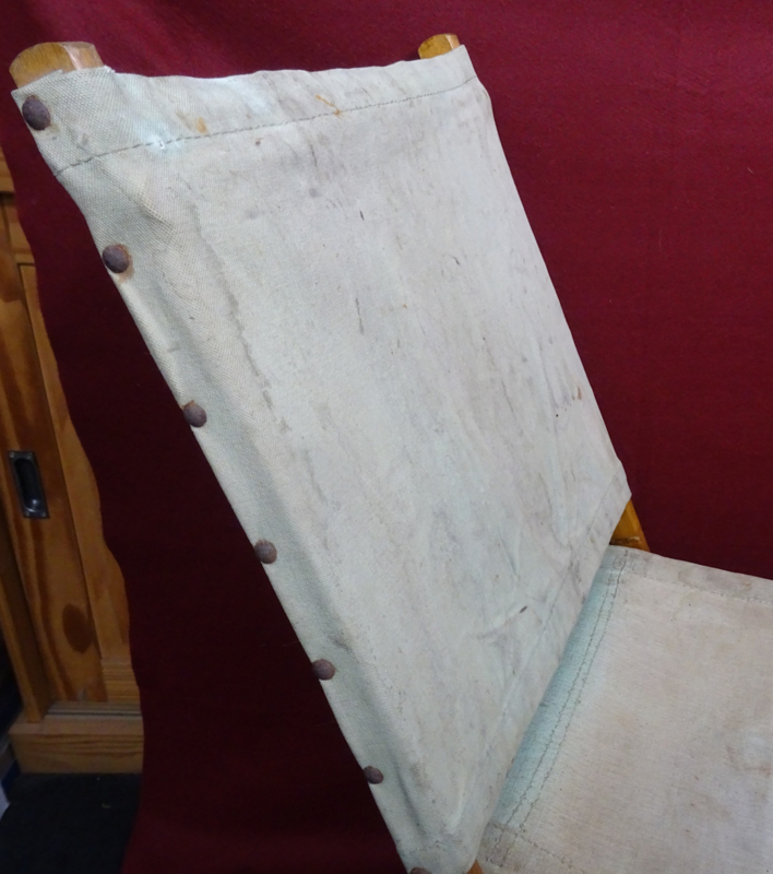 British officers folding campaign chair, wood and iron foldable frame with a canvas seat and back. Folds up into an easy to carry pack. Condition of the frame and canvas is good, and it could still be used if you wanted to. The canvas does show it's age and has some stains. I could not find a date on it but these were also privatly purchased and then there wouldn't be any stamp. An item you don't see very often!